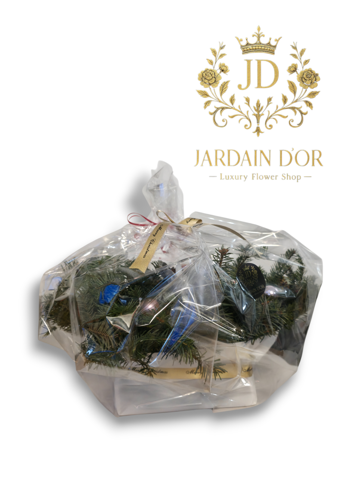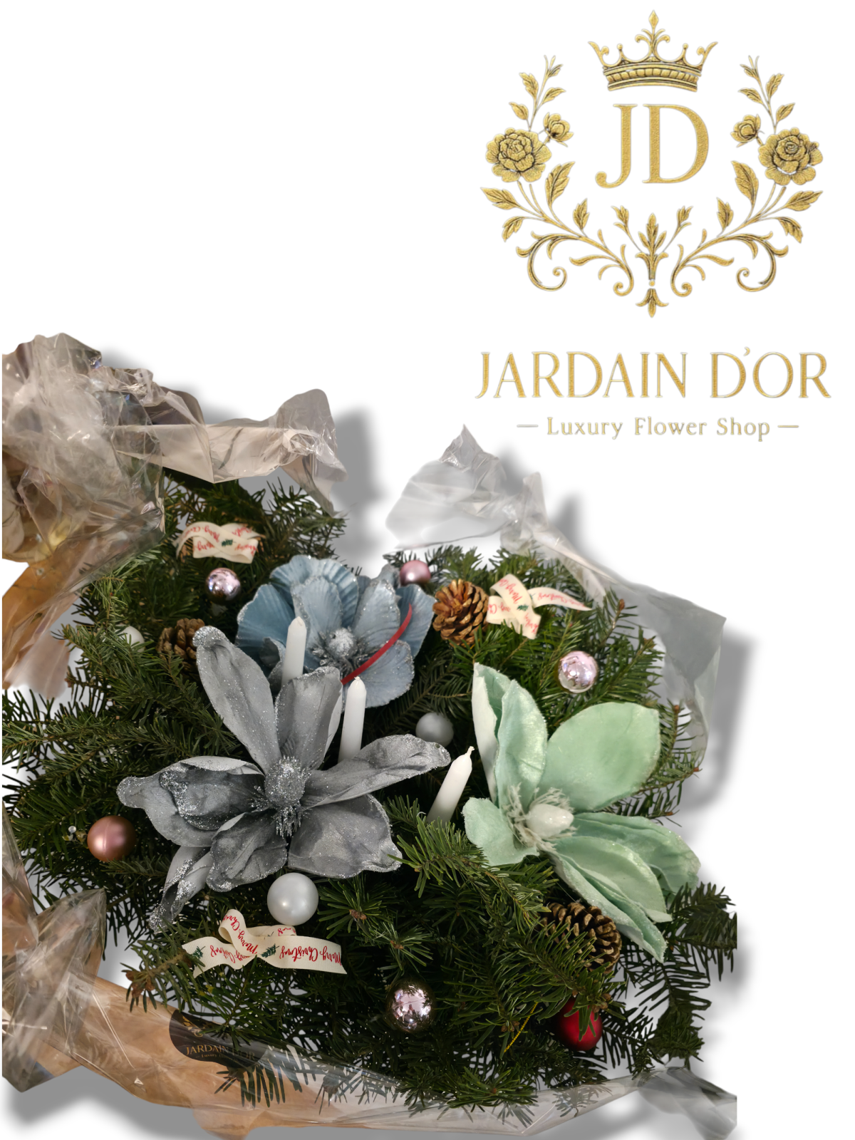 Îmbrățișați magia sărbătorilor cu această superbă creație, un aranjament premium ce îmbină eleganța clasică a bradului cu strălucirea modernă a nuanțelor glaciare.