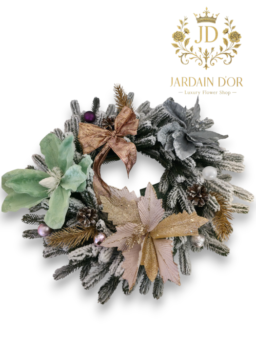 Arctique Royal– este mai mult decât o simplă coroană de iarnă — este o capodoperă decorativă, creată pentru a aduce rafinament, armonie și magie în orice încăpere. Realizată manual, din ramuri bogate de brad presărate cu zăpadă fină, această coroană impresionează prin echilibrul perfect între nuanțele reci și strălucirile calde.