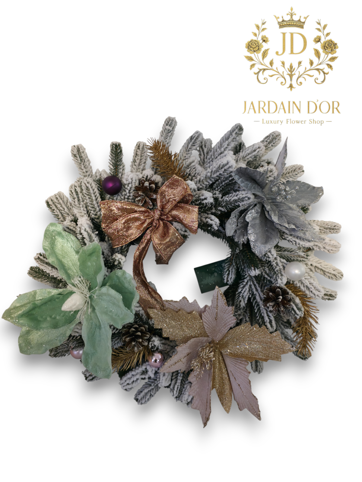 Florile decorative în tonuri pastelate de auriu, mentă înghețată și argint metalic oferă un joc subtil de lumină și textură, în timp ce conurile naturale și accentele aurii completează aspectul luxuriant. Ornamentația delicată din globuri sidefate adaugă profunzime și eleganță, transformând aranjamentul într-o adevărată piesă statement pentru sezonul festiv.