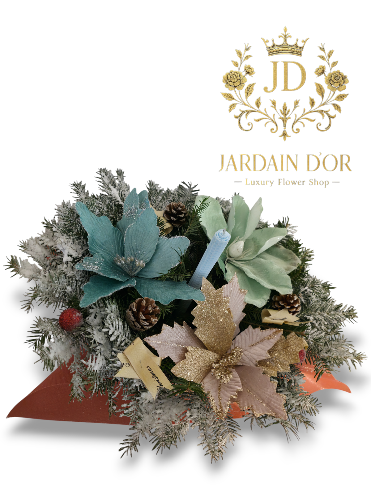 ​Introduceți o notă de căldură și rafinament în decorul dumneavoastră cu acest aranjament fermecător, un omagiu adus nuanțelor reci ale iernii și eleganței clasice.