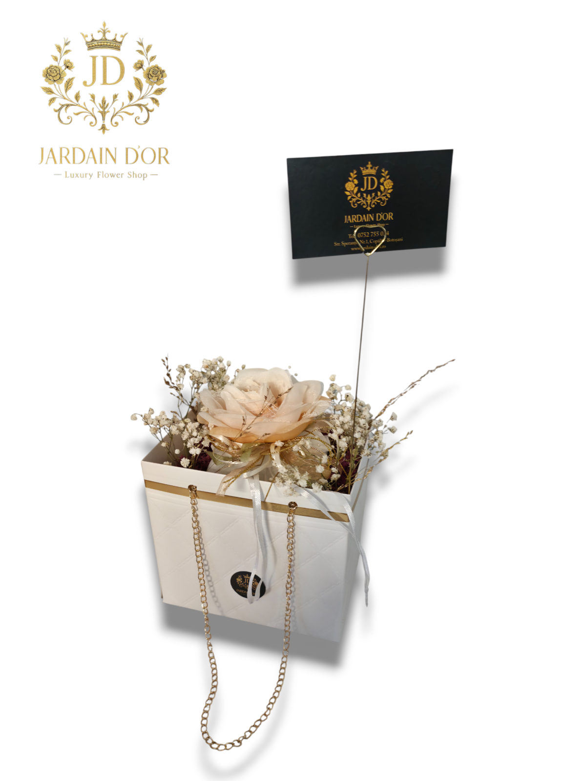 Fiecare aranjament este prezentat într-o cutie stilizată, ce imită o geantă de designer, completată cu lanțuri aurii și finisaje premium.