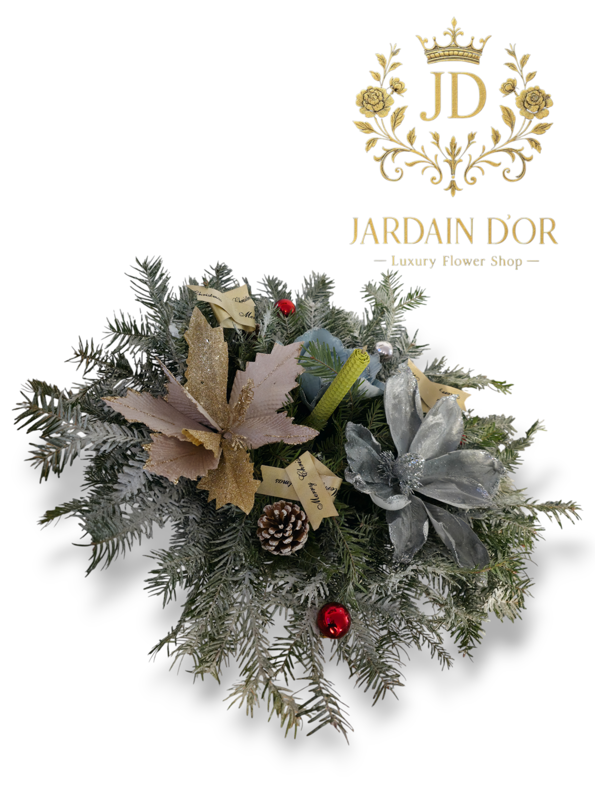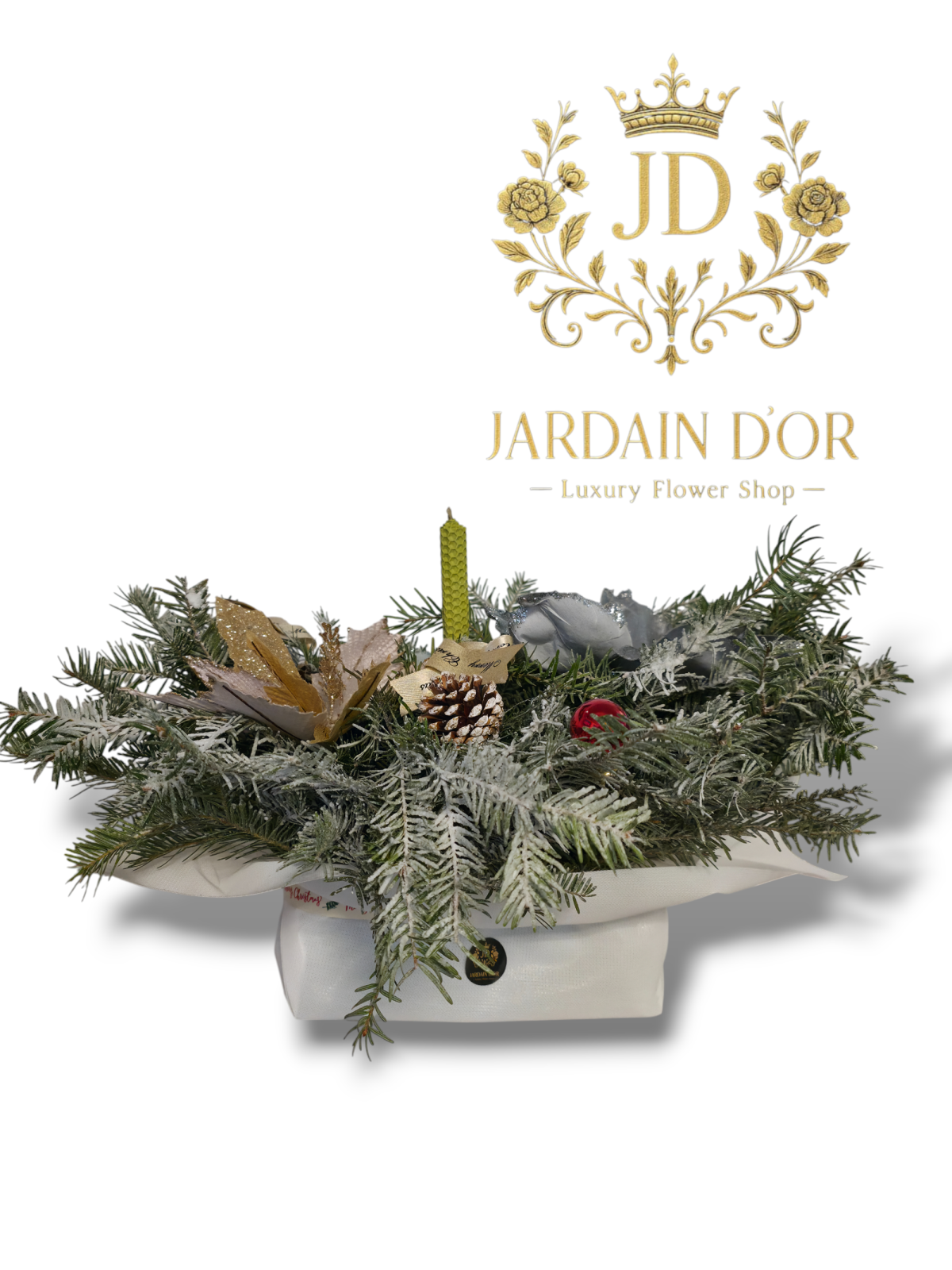​Acest aranjament este un simbol al ospitalității și rafinamentului. Dimensiunile sale compacte îl fac ideal pentru a aduce spiritul sărbătorilor în orice colț al casei sau la birou.