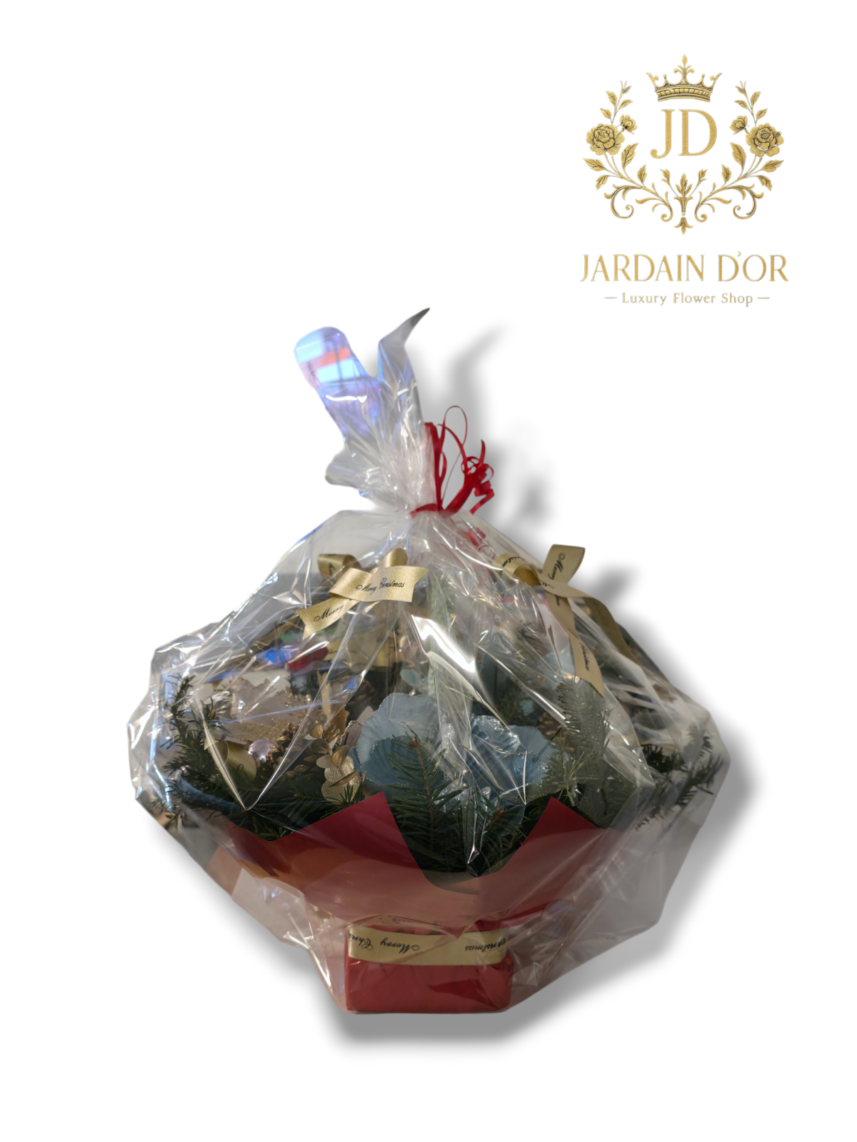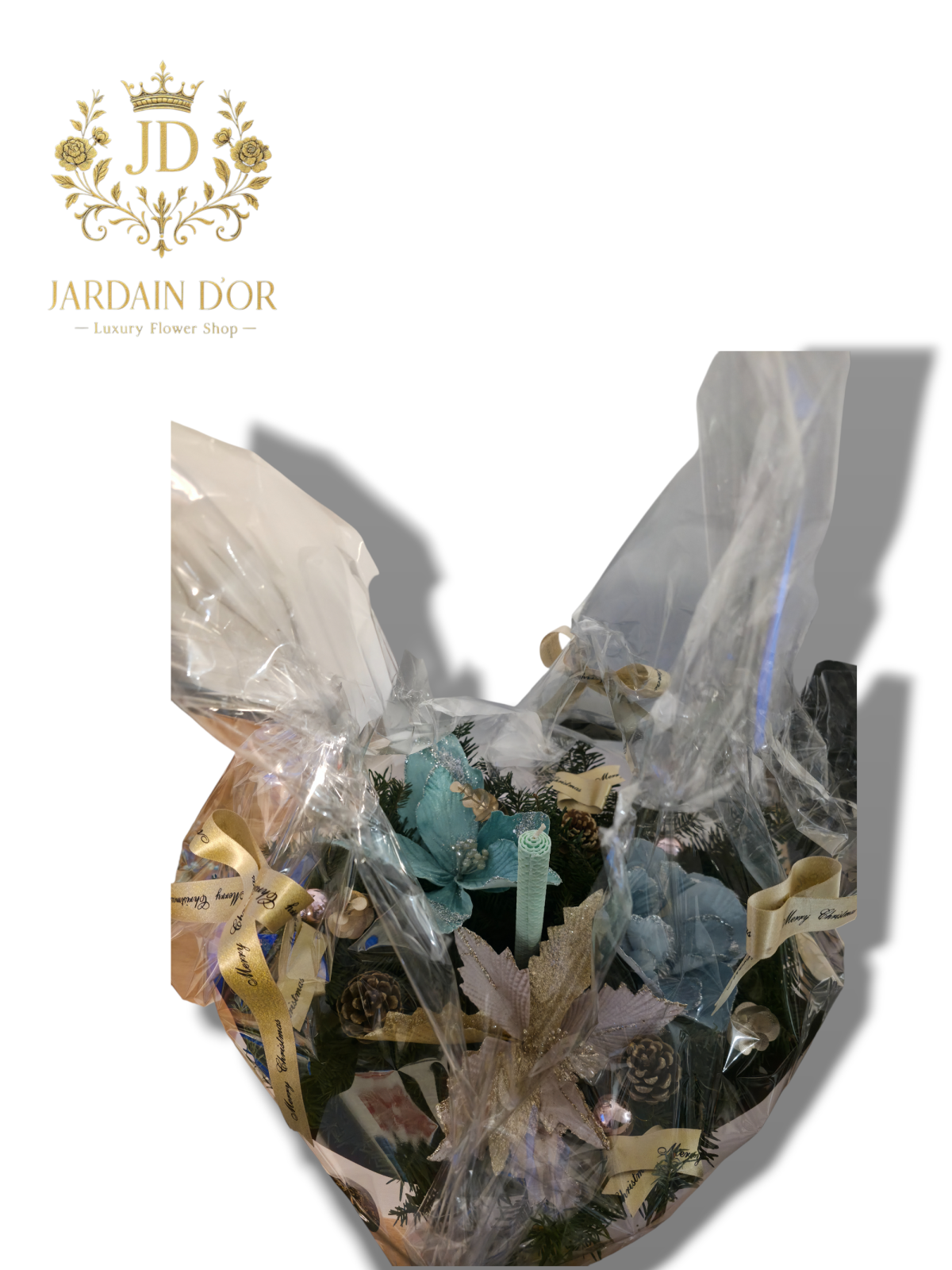 Panglici Festiv: Aranjamentul este împodobit cu panglici înguste de culoare aurie, pe care este inscripționat mesajul "Merry Christmas" în culoare închisă. Aceste panglici sunt legate în fundițe elegante și integrate în compoziție.