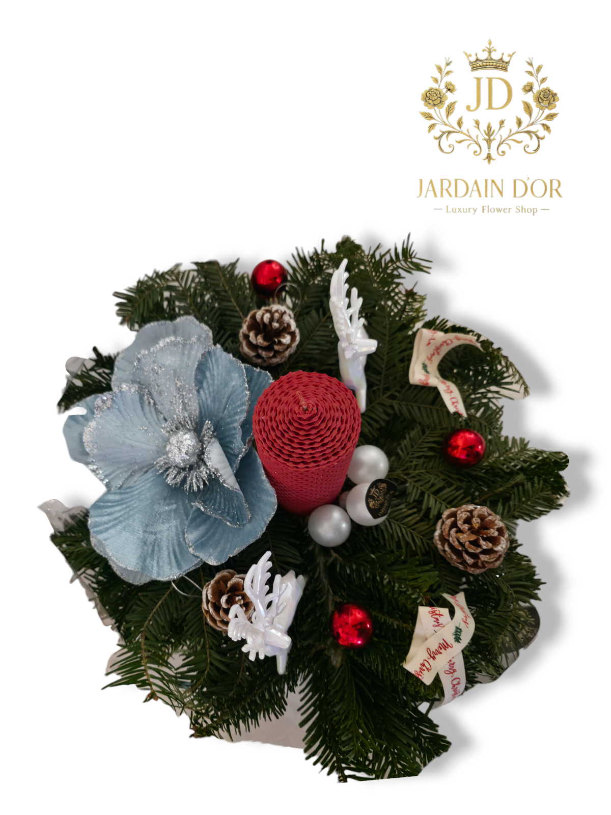 Aranjamentul este unul echilibrat, care combină simbolurile clasice ale Crăciunului (verde, roșu, conuri) cu accente moderne și reci (bleu, alb și argintiu), creând o decorațiune elegantă și festivă.