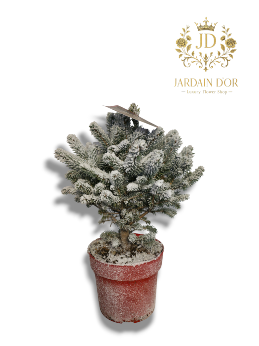 Aspect Geros: Brăduțul (natural în ghiveci de înaltă calitate) este acoperit cu un strat dens de zăpadă artificială (snow flock). Această textură pufoasă imită perfect prima ninsoare, creând o imagine idilică.